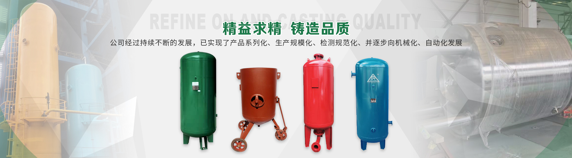本企業產品有眾多產品分類,儲氣罐、磨料桶、碳鋼儲氣罐、不銹鋼儲氣罐、中高壓儲氣罐、臥式儲氣罐、緩沖罐、隔膜罐、噴砂罐、分氣缸、以及其他的定做非標產品等,產品廣泛應用于化工、制藥、橡膠、石油、食品、機械等行業。